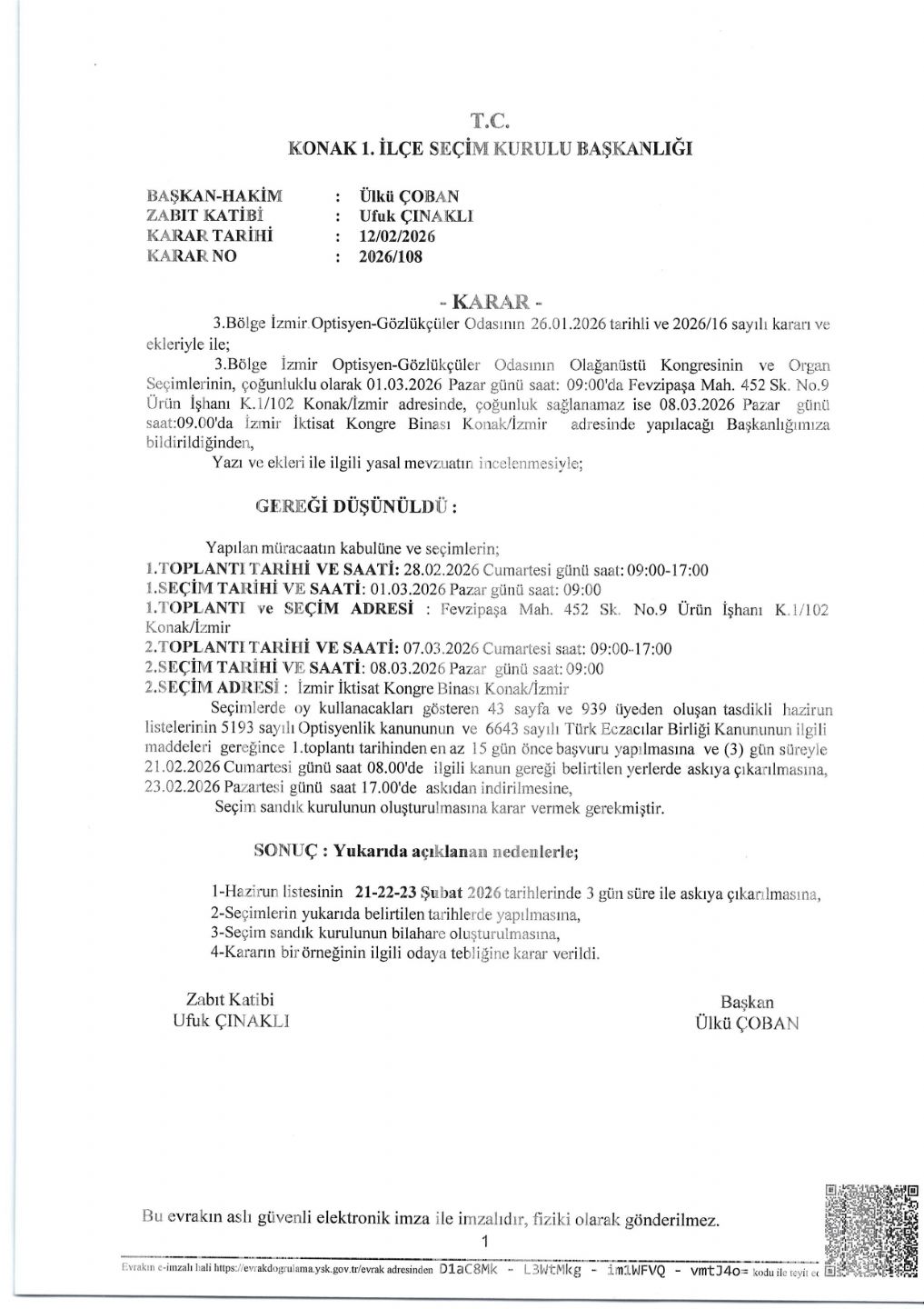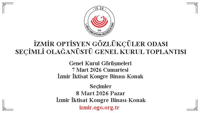 Konak 1. İlçe Seçim Kurulu Başkanlığının 13/02/2026 tarih ve E.88442439-140.08-81540 sayılı Üye listesinin askıya çıkarılması konulu yazısı gereği aşağıda yazılı tarihlerde ve gündem maddeleri ile yapılacak Odamızın Olağanüstü Seçimli Genel Kurul Toplantısında oy kullanacak üye listesi 21-22-23 Şubat 2026 tarihlerinde saat 08.00’den 17.00’ye kadar 3 gün süre ile Oda ofisimizin kapısında asılmak suretiyle tarafımıza gönderilmiştir ve askıya çıkarılacaktır. İlçe Seçim Kurulu Kararı ve Genel Kurul gündemi aşağıda bilgilerinize sunulmuştur.